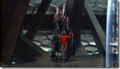 In the six minute original edit, things take place as in the theatrical version, except Ellie is never possessed. The alien reveals itself as a nightmarish creature floating through the chapel, zapping the boyfriend with laser bolts from its eyes before taking Jan and disappearing. It is insect like, but also resembles a wraith with tattered “wings” that serve as arms. The design is ideal for giving little kids bad dreams and is a rather impressive piece of practical effects work.