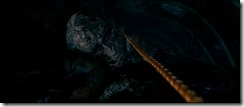 The ship of Geats (Swedes) lands on shore and are greeted by a shore watchman. Greetings of the era entail sticking a spear in Beowulf’s face in a shameless example of overusing 3D effects. It is far worse than the paddleball in House of Wax way back in the 1950s. Even in 2D it gives me a headache. There are multiple instances of things being shoved in your face crying out, “look at me!”